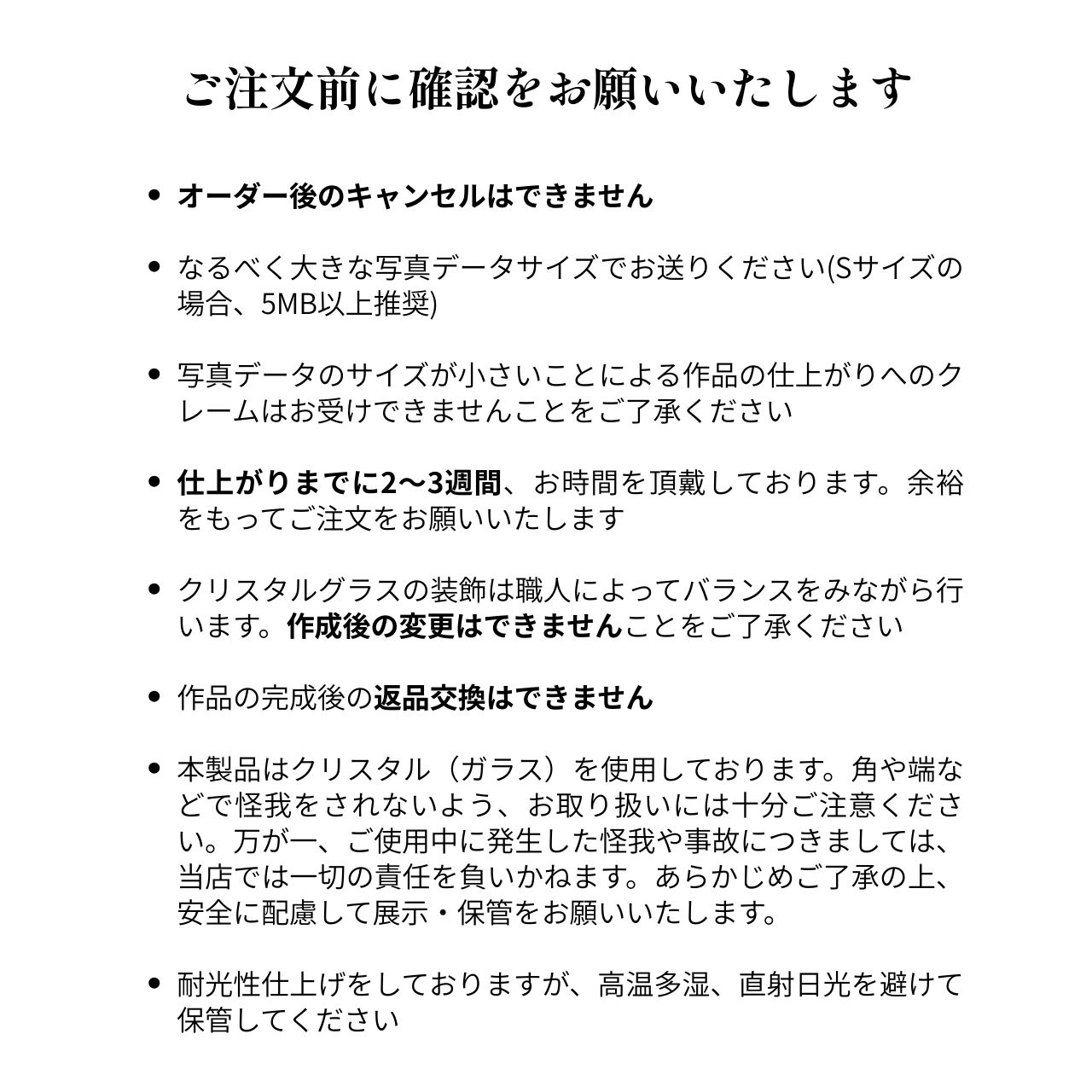 ・クリスタルグラスの装飾は職人によってバランスをみながら行います。作成後の変更はできませんことをご了承ください